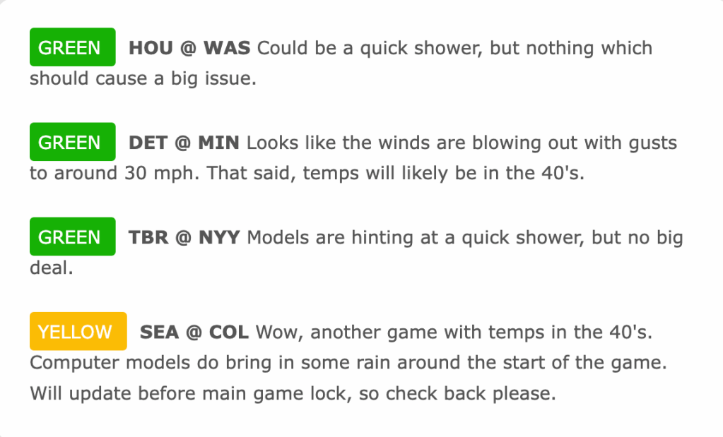 Time for the slate! The biggest weather concern today is Rockies vs Mariners in Coors, and I’m not sure if the field just hates these offenses or is worried about rain/snow, but both of these offenses are readily available in drafts in a game with the highest total on the slate. Interesting!