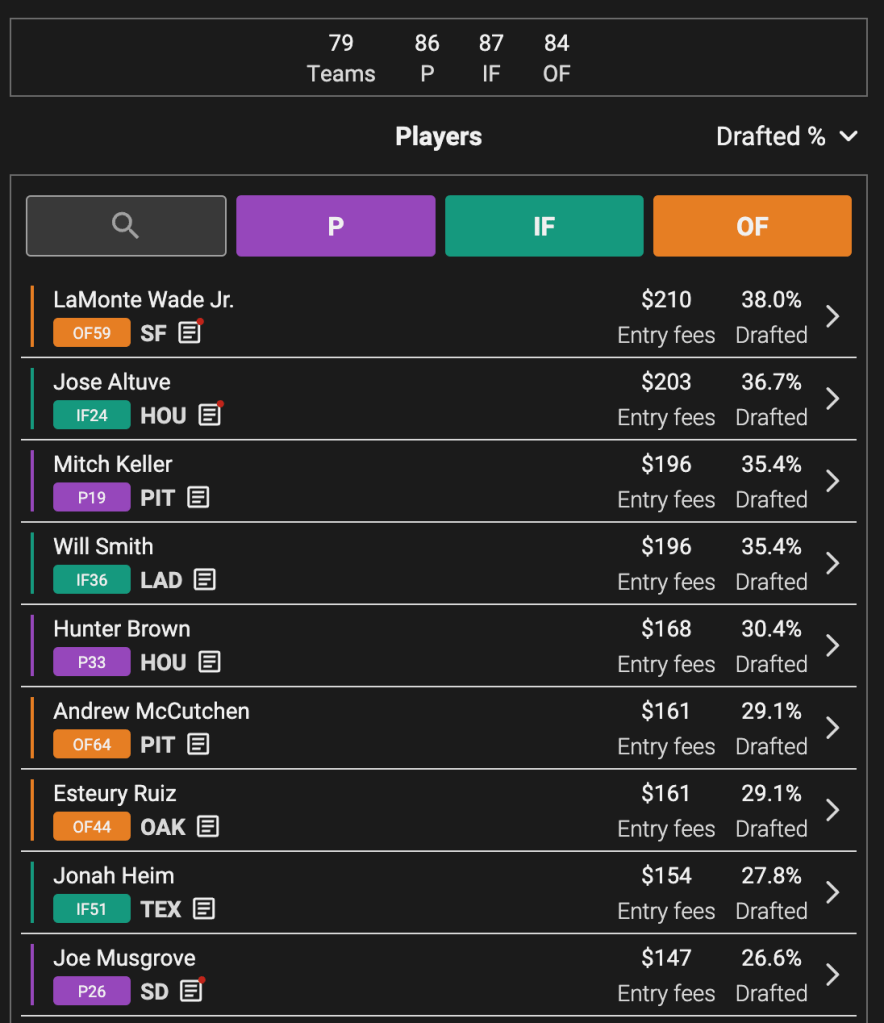 We’re also one whole week into the best ball playoffs. Per CBS, here are the likeliest two start pitchers this week along with their ownership percentage: