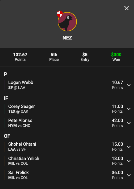 We like the Perfect Game start! I have thankfully some pretty healthy rosters for both of those teams, so I am feeling cautiously optimistic for those teams. As for the Dinger? I feel (obviously) less bullish. I knew this from the beginning as I was looking at my advanced teams prior to the QF that my teams were very much not strong. Riddled with injuries and underperforming players, I felt as though I was kissing my Dinger chances good bye before the playoffs even started. All it takes is one to win, but I’m not getting my hopes up.